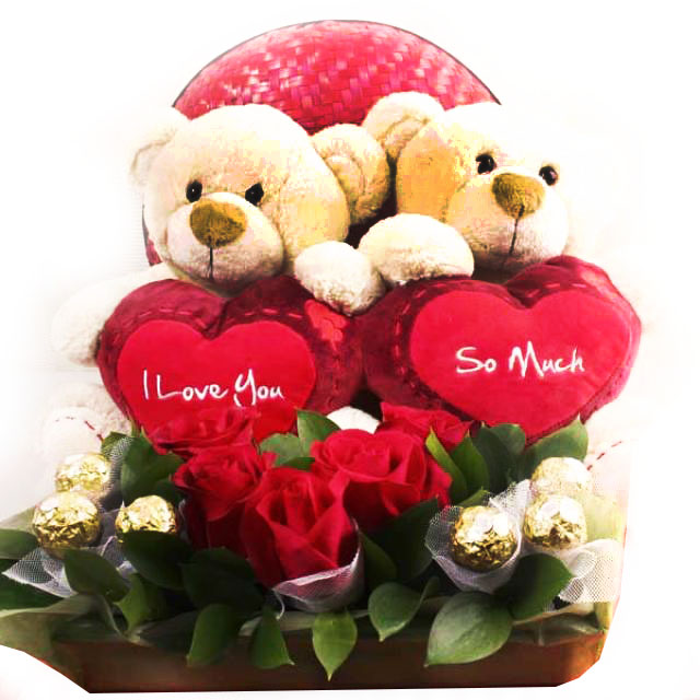 2 Peluches Corazón, 10 Rosas y Bombones