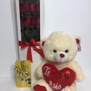 Caja con 12 Rosas más Bombones de 100 Grs y Peluche de 45 cm