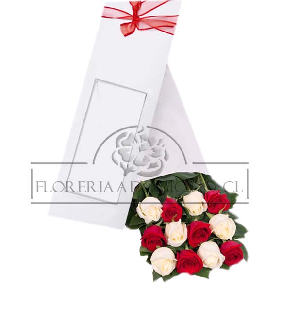 Finas Rosas importadas 12 Unidades, en elegante Caja Blanca, ligadas a un combinado lazo de organza.