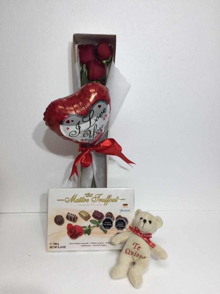 Caja con 3 Rosas más Bombones de 180 Grs, Peluchito y Globito