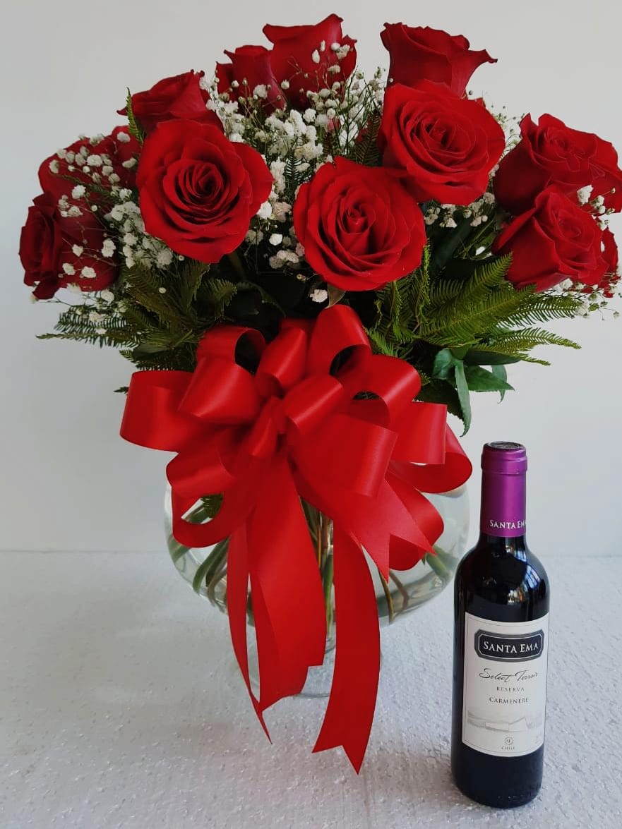 Copa de 20 Rosas mas Vino Santa Ema de 375 ml.Tamaño aproximado 50 cm. Diseño sujeto a disponibilidad.