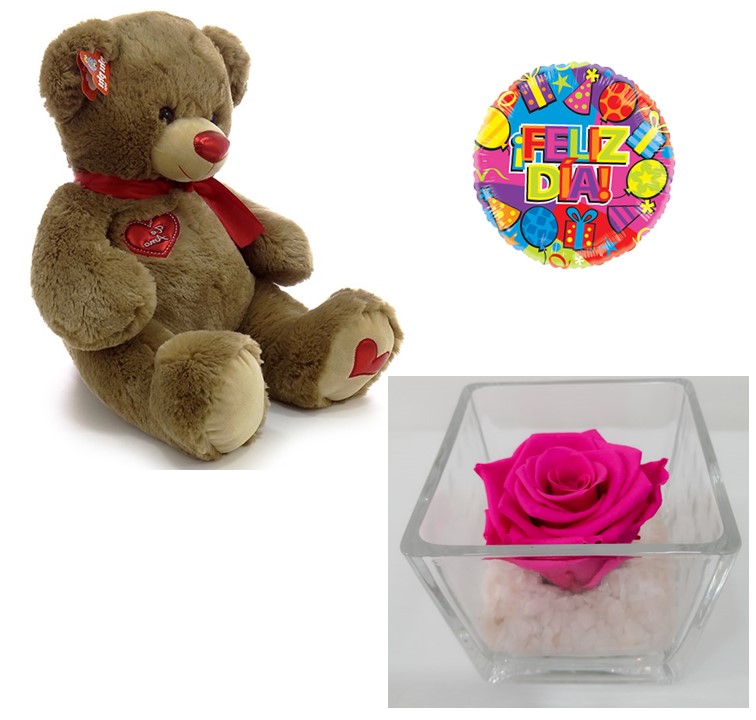 Peluche 45 cm más Rosa Preservada en Cubo y Globito