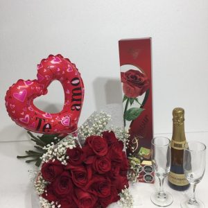 Rosa Preservada con tallo en Cúpula, Bombones Ferrero Rocher 150 grs, Vino 375cc y 2 copas
