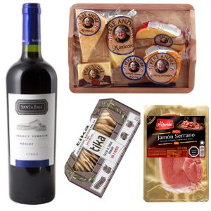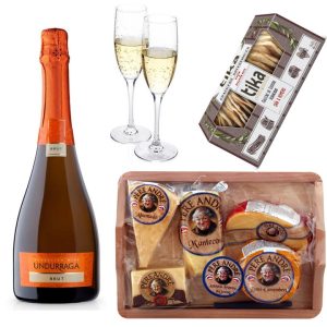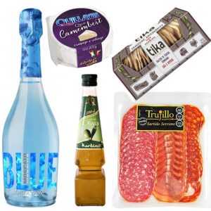 Espumante Opera Prima Blue, Surtido Serrano, Queso camembert y Galletas Crackers y Aceite