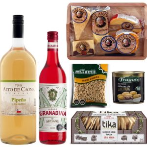 Caja de 5 Quesos, Vino Pipeño, Jarabe De Granadina Maní, Aceitunas y Galletas Crackers